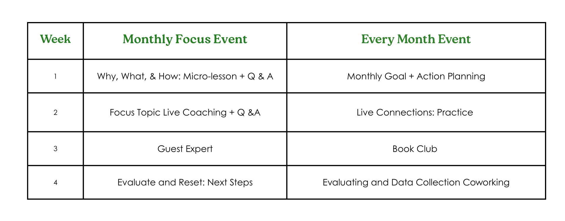 - 8 monthly events (half are dedicated to the monthly focus which is always one of the four framework areas! - see the grid below for the breakout of events!),
